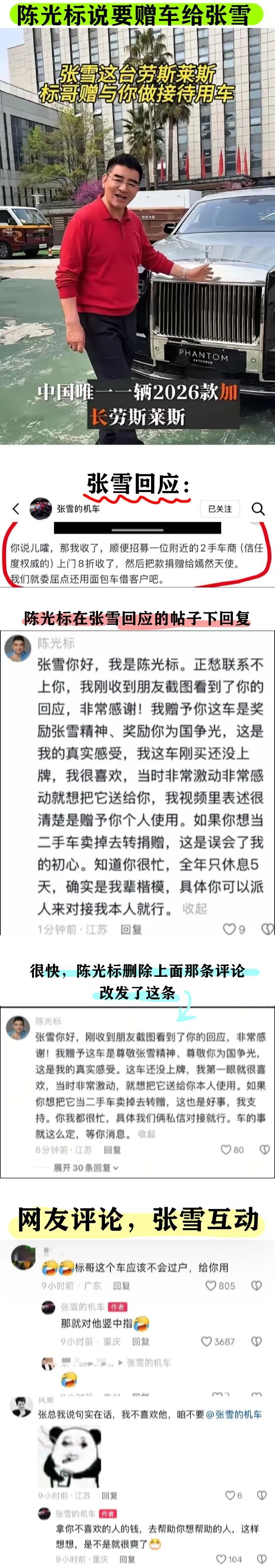 但是没想到,张雪也是爱刷短视频的,之前陈光标那嫣然天使炒作的时候,张雪可是记住了,并且心里看不起这种拿慈善弄虚作假,投机取巧的人,所以直接不按套路出牌,估计张雪开始也觉得陈光标不会真的拿出车来捐了。