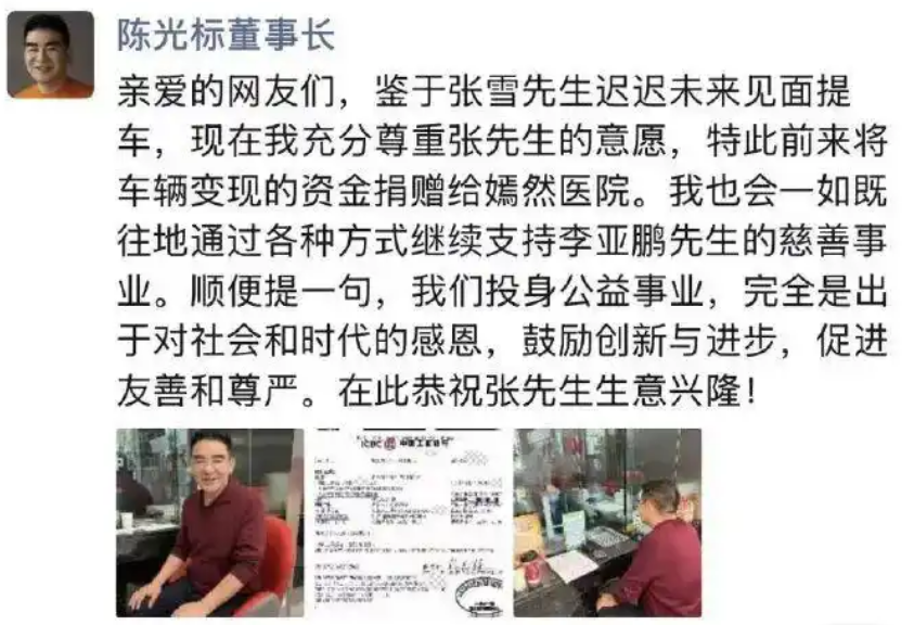 昨天,陈光标朋友圈晒图:尊重张先生的医院,将车辆变相,捐款。
